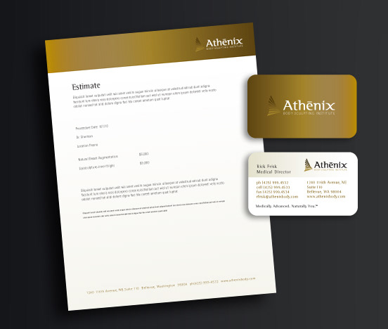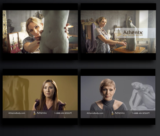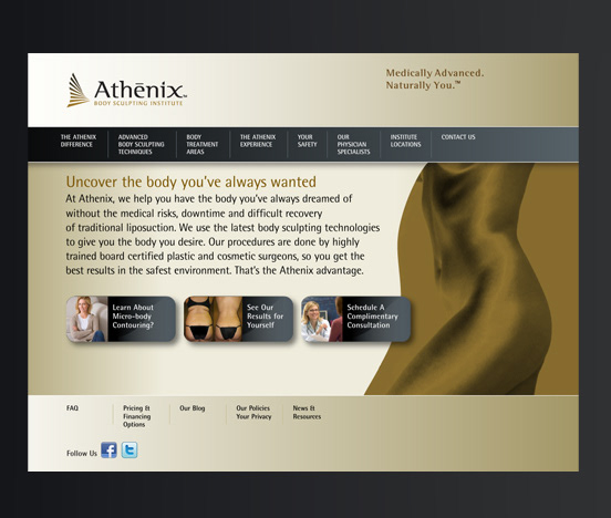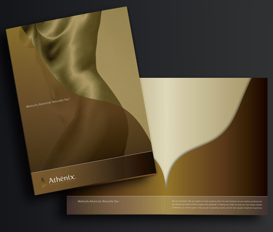 Athenix, Body Sculpting Institute was a new cosmetic surgery chain on the U.S. west coast. After an initial research period and competitive analysis, we created an identity that feels warm, beautiful and empowering. The name derives from the Greek goddess Athena who was known as the patron goddess of the sculpting arts and used wisdom as a problem solving technique. Brand emphasis was placed on medically sound procedures, using testimonials and informational graphics to demystify the cosmetic surgery process whenever possible. A rich metallic color scheme and traditional typography compliment the high-end spa feeling of the Athenix experience.This project included brand strategy, naming, tagline, logo, look and feel, 60 second TV commercial, media buy, collateral and website design and social media campaign.