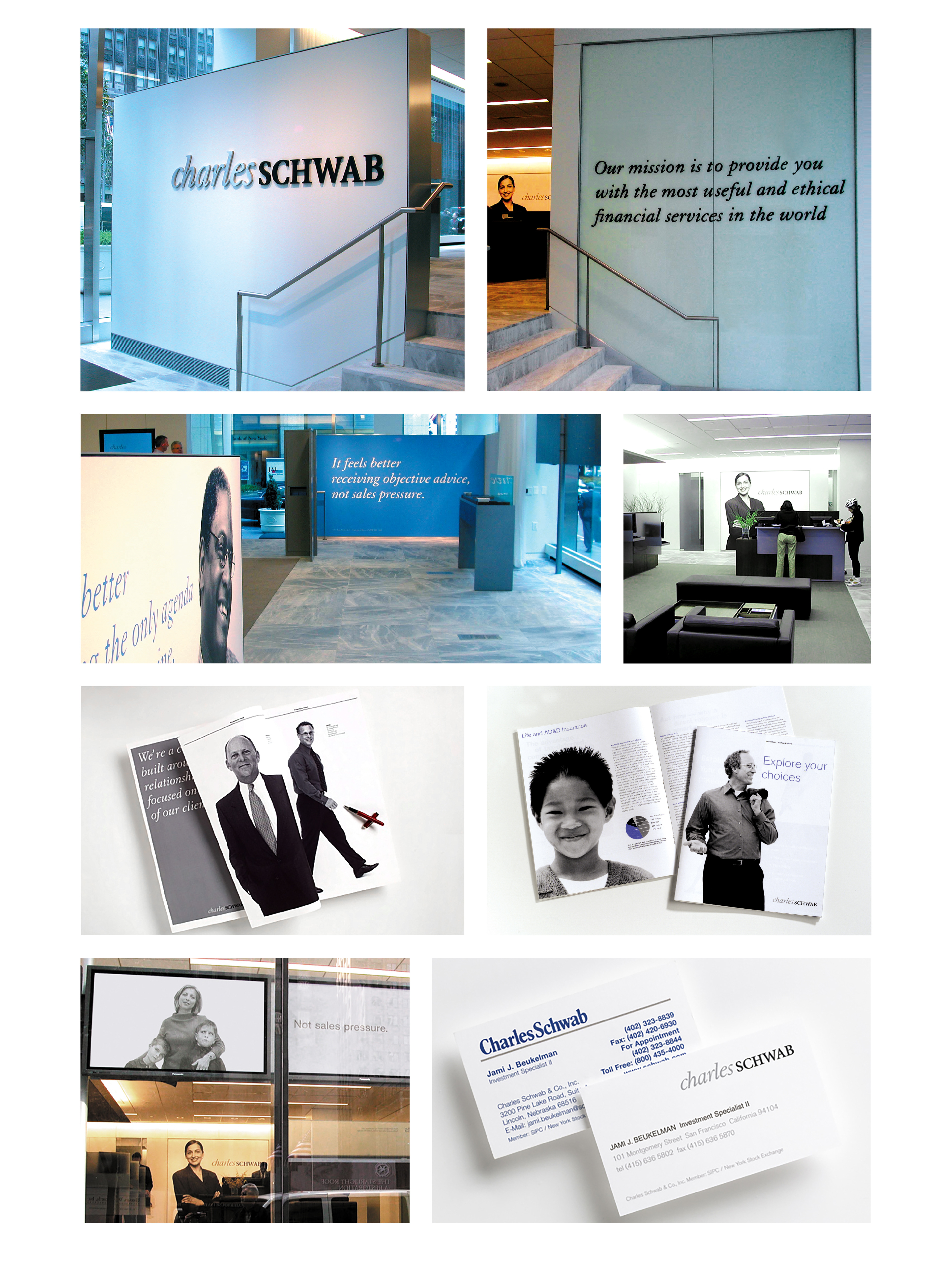 As the original self-serve financial market company, Schwab's original identity had been around since the 70's. Following a strategy that emphasized the personal, the logo is a combination of a more casual Charles, married with a more formal Schwab. The lower case letters symbolize the personal, the uppercase letters symbolize the solid financial institution. A month of shooting created a library of imagery to launch the new identity with. I oversaw this work for the Corporate Identity Group at Landor Associates.