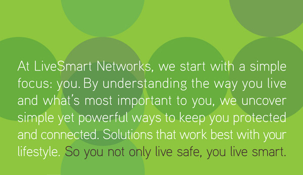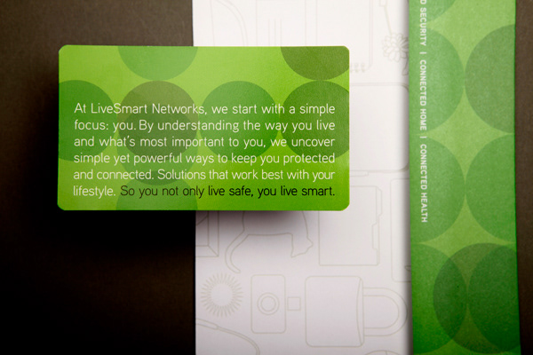 This identity was created as a modern alternative to what traditional home security identities look like. The client wanted the company to feel different. The core strategy centered on the premise that not only are your things being protected, but the things that make your life important . As a reflection of the role of technology, the idea of connectivity is reflected in the circular pattern background and overlapping circles in the logo.