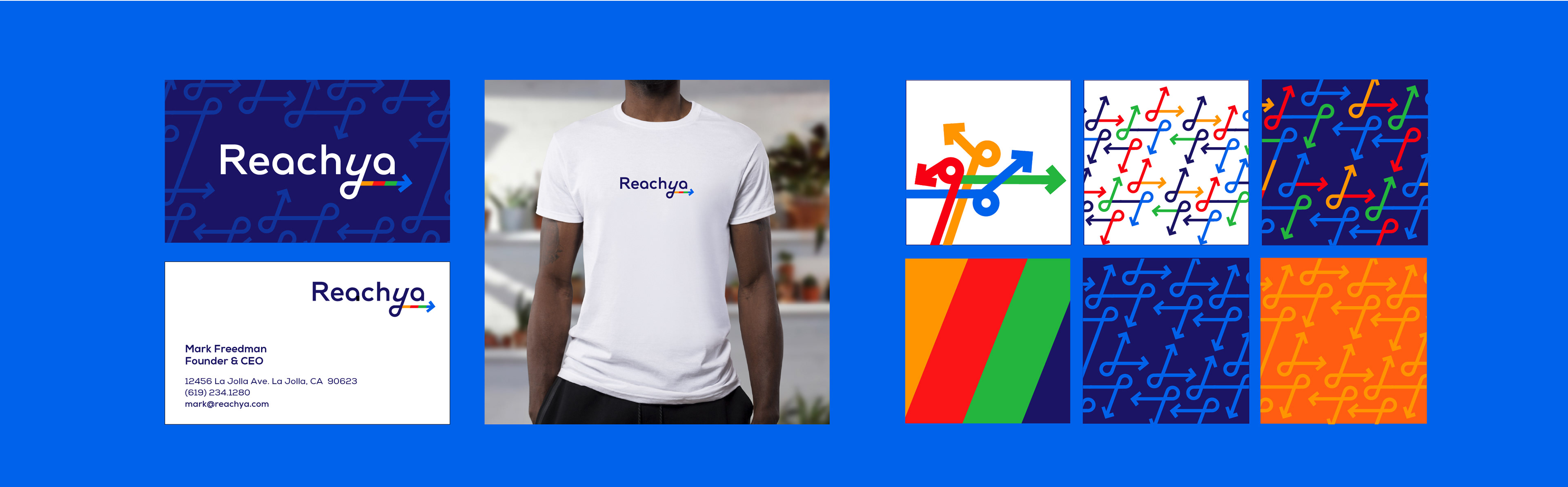 A new identity for a text based marketing app. Reachya allows their clients to create visual text messages and reach their audiences directly. A visually rich palette and style distinguish Reachya from existing competitors. Primary colors are a comment on the visual toolkit that is a hallmark of the app.