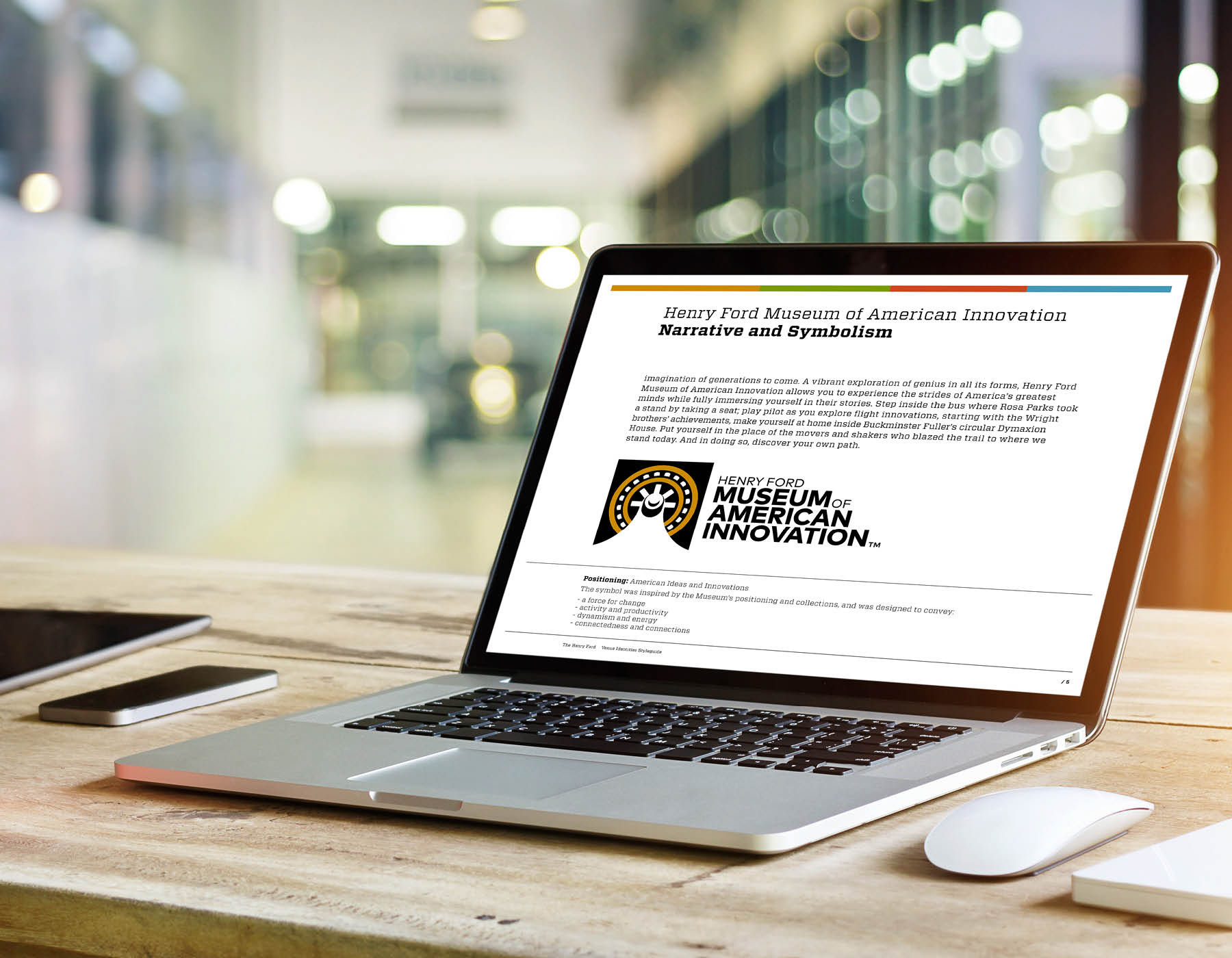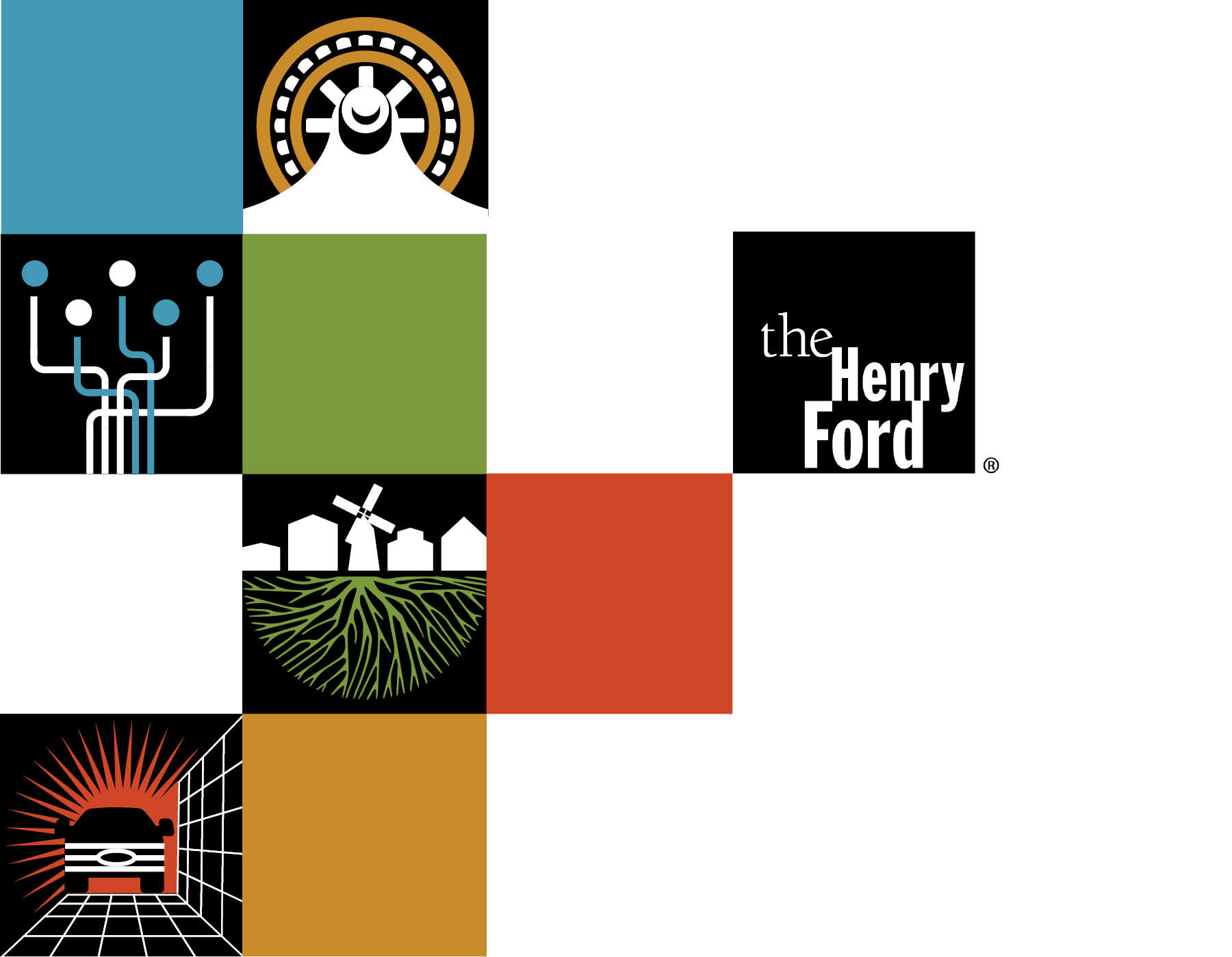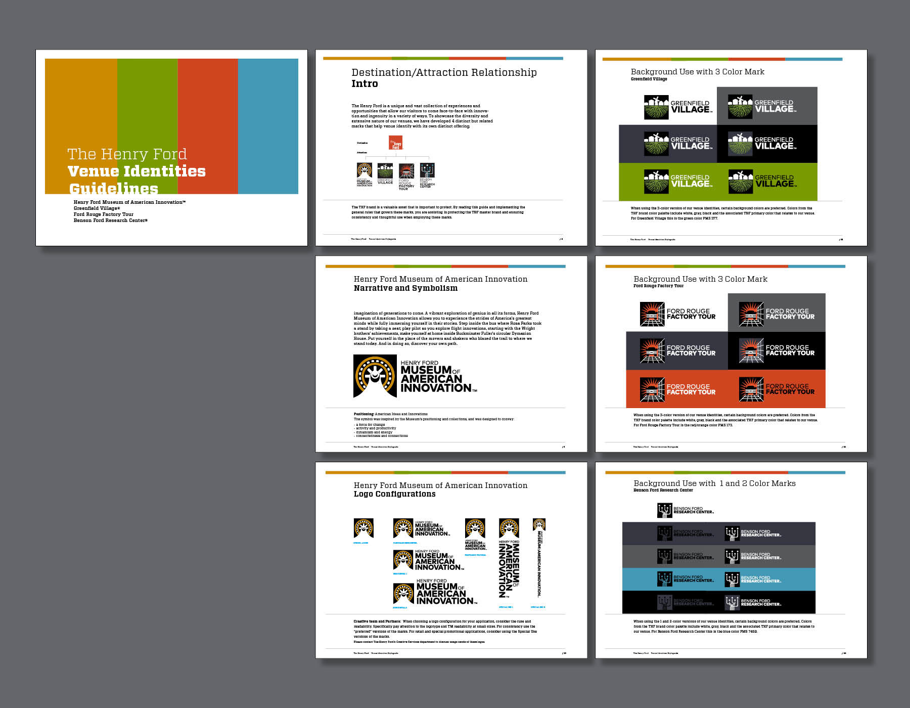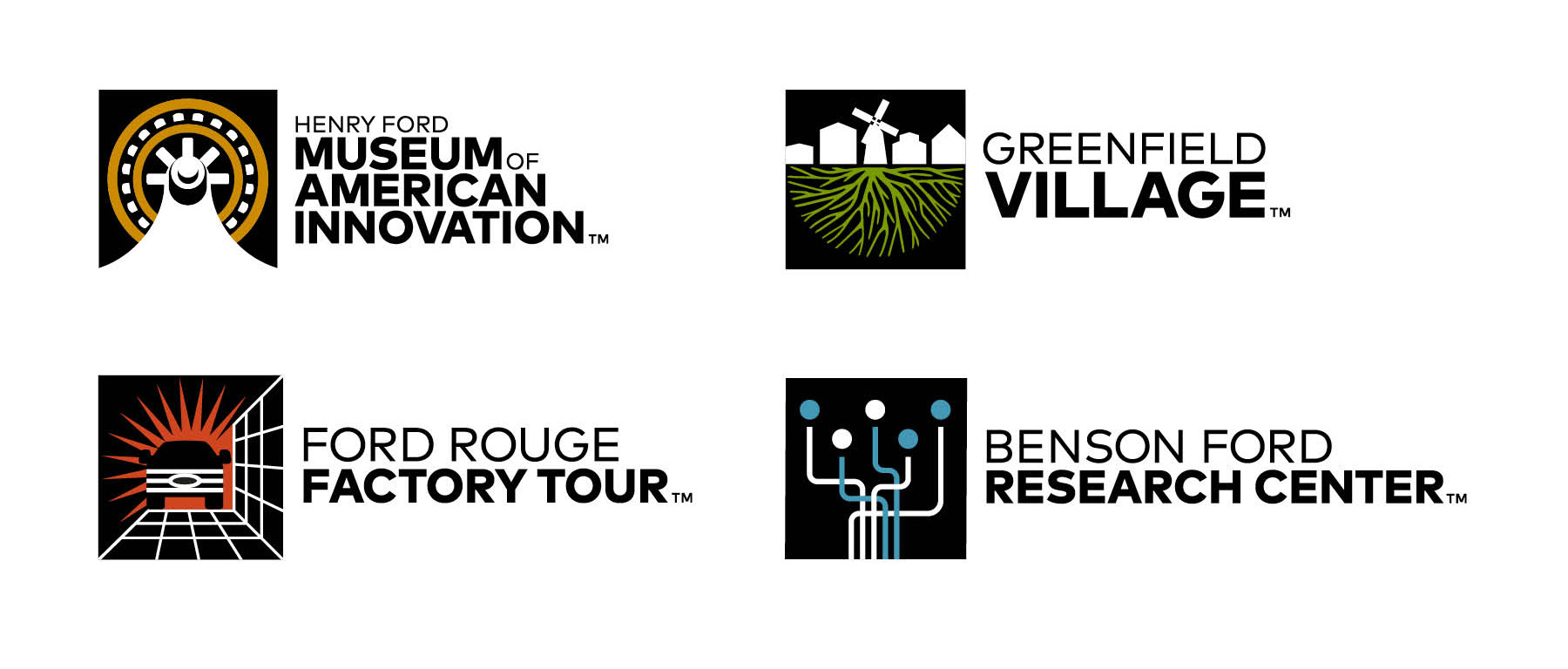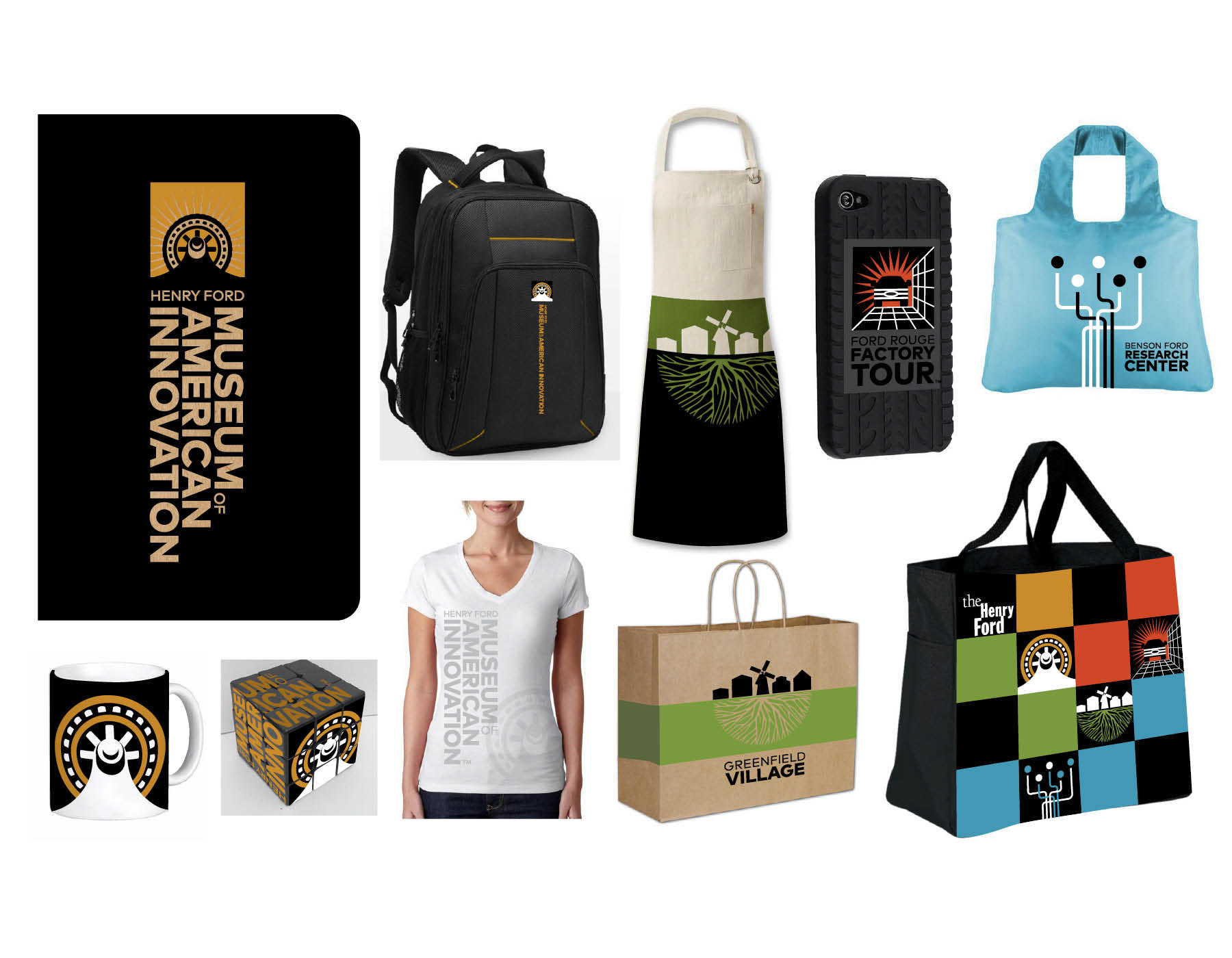 The Henry Ford is a major museum, living history, research archives and attraction outside of Detroit MI. It is a long standing institution started by Henry Ford to showcase American Innovation. As part of a strategy refresh, the museum chose to change it's name to "Henry Ford Museum of American Innovation." A new identity for the museum created an opportunity to rebrand the institutions 3 other major areas of focus: Greenfield Village-a working village and living history project, The Ford Rouge Factory Tour-a working Ford plant, and The Benson Ford Research Center-a vast collection of Americana and artifacts. The identities needed to work well together and with the existing Henry Ford logo. They also had to be versatile enough to work with everything from signage to retail items. The system consisted of many logo configurations for each mark in order to accommodate the wide range of needs. A full retail style guide accompanied the program which served as a basis for creating retail merchandise to be sold at the museum stores.